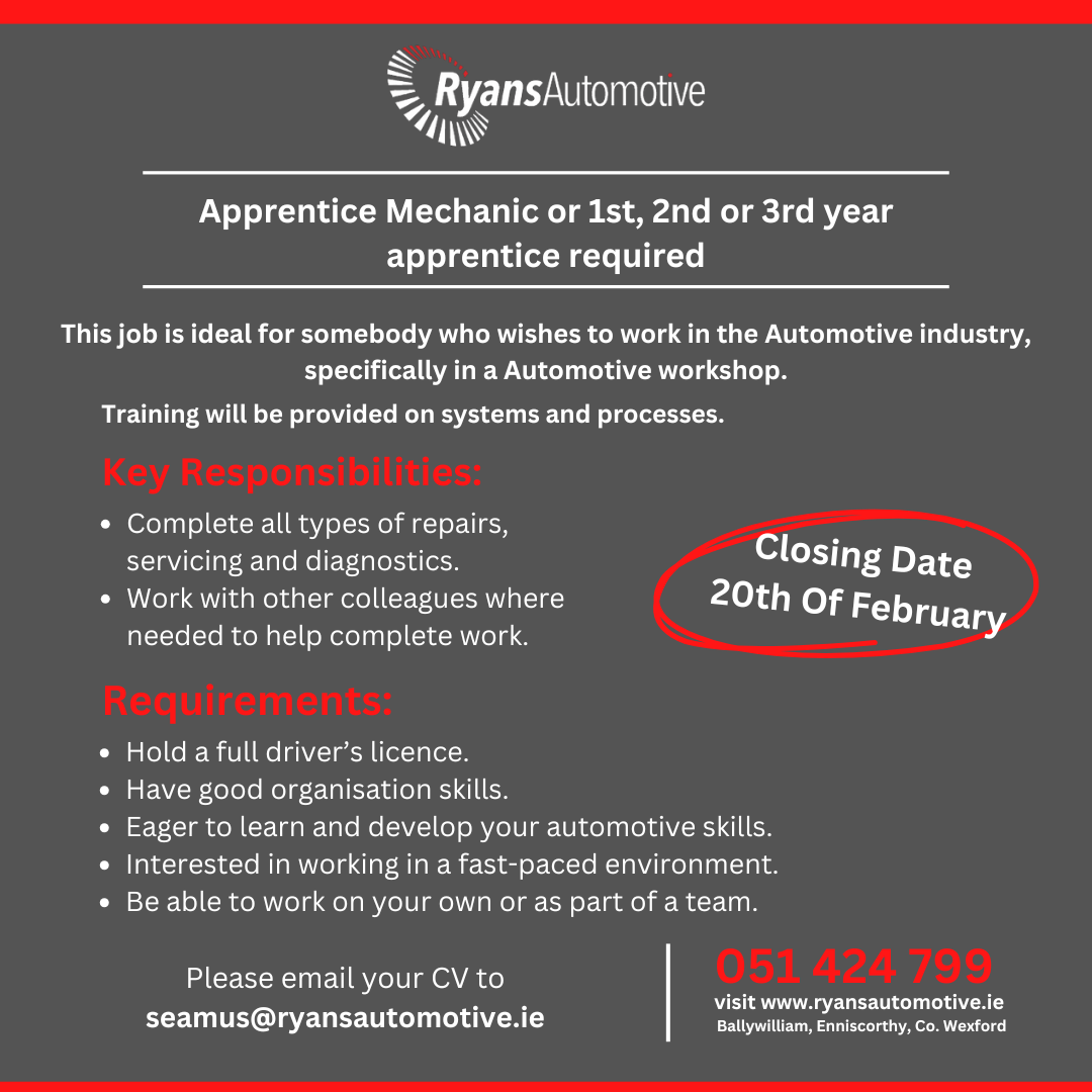Work Location: Ryans Automotive, Ballindoney, Ballywilliam, Co. Wexford, Y21PC98