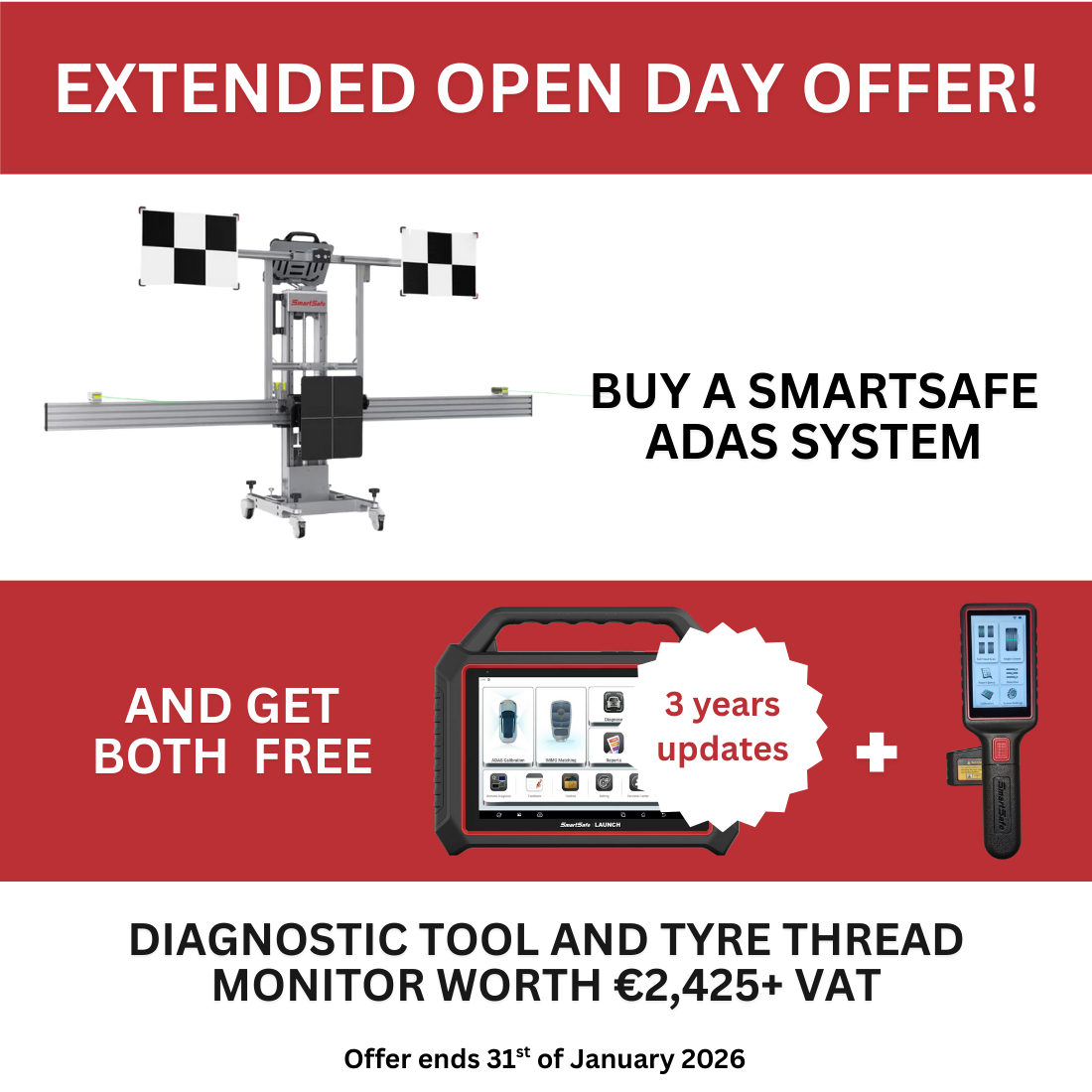 Get a free SmartSafe/Launch iSmartLink ST10 Diagnostic Tool With 3 Years Updates and SmartSafe TTM313 Tyre Thread Measurement Tool worth €2,425 +VAT when you purchase this ADAS kit, offer ends the 31st of January 2026.