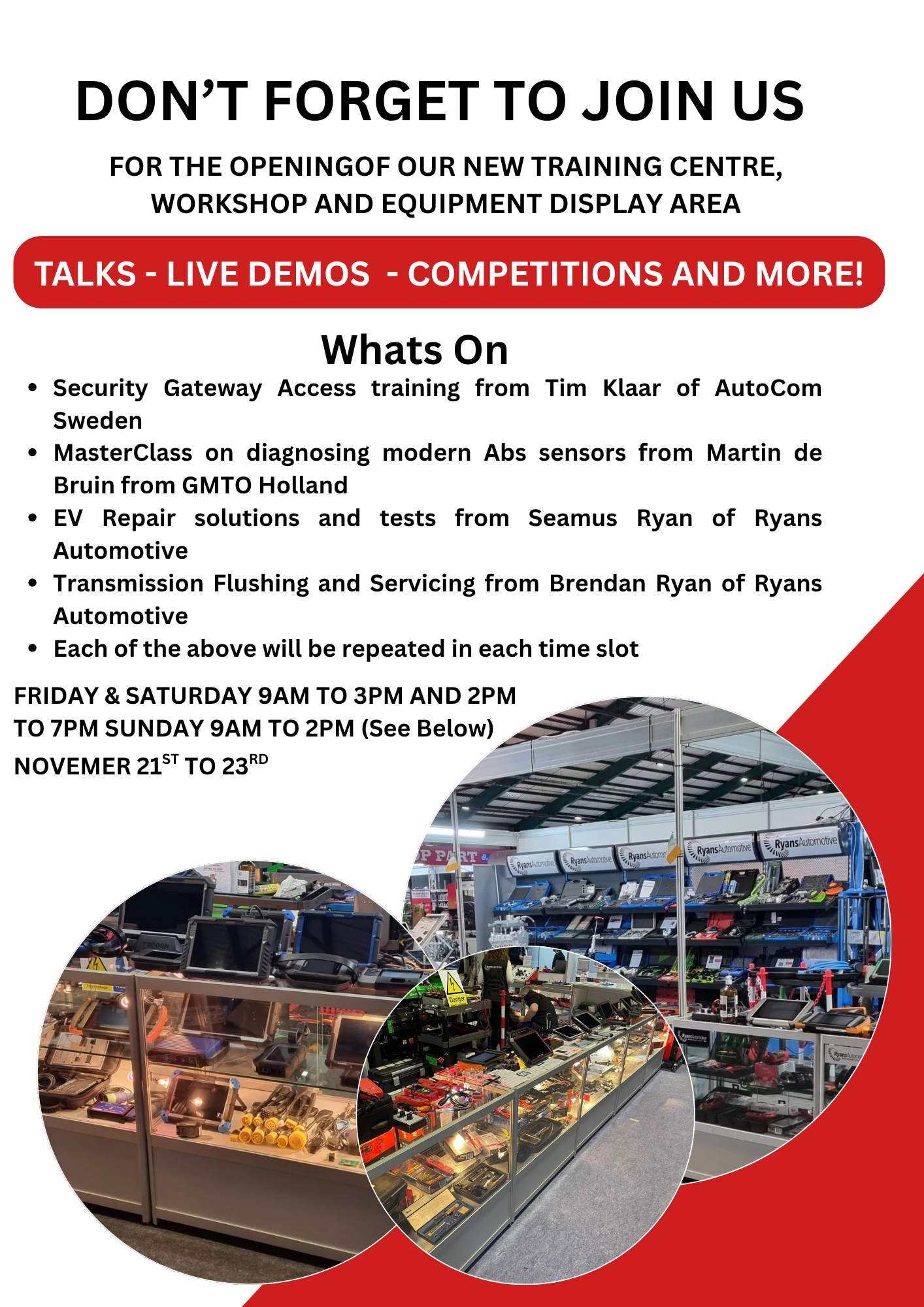 Join us for an engaging day featuring demonstrations, training and insightful talks from representatives of companies like Autocom, GMTO and Ryans Automotive. It’s a great opportunity to learn about the latest innovations in our field and see our new facilities in action.