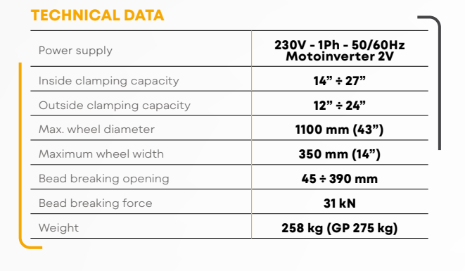 Great versatility thanks to wheel clamping capacity up to 24″.