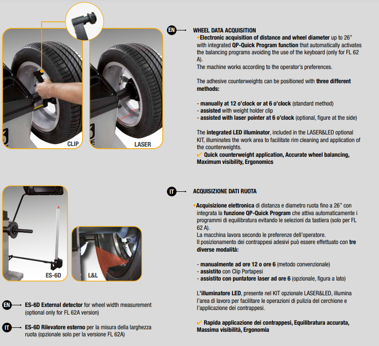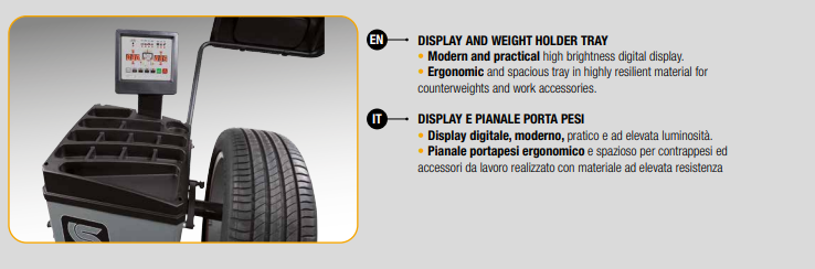 Digital display wheel balancer completely automatic cycle and software compatible with all types of steel and light alloy wheels for passenger cars, off-road vehicles, light commercial vehicles, motorcycles and scooters.