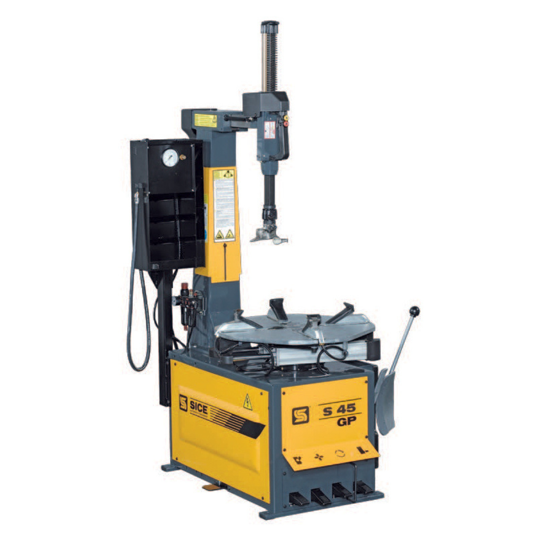 Automatic car tyre changers with simultaneous pneumatic horizontal and vertical arm locking.